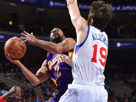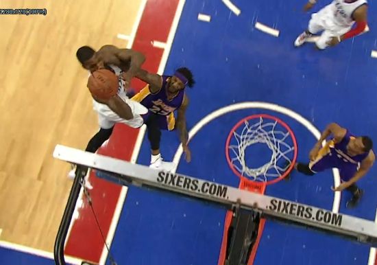 北京时间3月31日,NBA常规赛湖人迎战76人。比赛中,湖人队塔勒克-布莱克抢断后约翰逊空中接力得手…